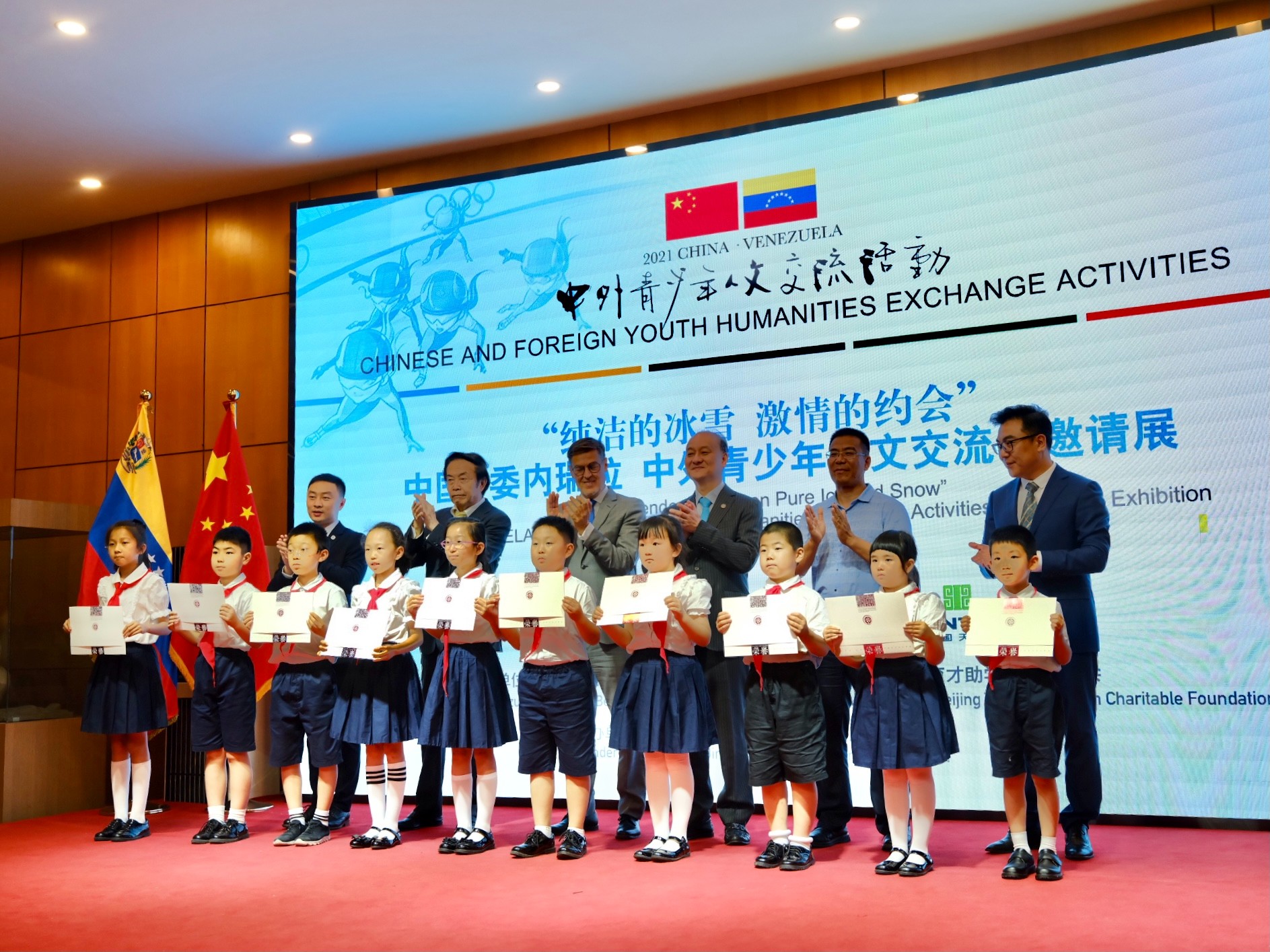 中國和委內(nèi)瑞拉兩國青少年創(chuàng)作的158幅以“北京冬奧”為主題的作品參展。除了委內(nèi)瑞拉駐華大使菲利克斯·普拉森西亞和23位駐華使節(jié)外,北京奧運城市發(fā)展促進中心領(lǐng)導(dǎo)、第十一、十二屆全國政協(xié)常委、北京金臺藝術(shù)館館長袁熙坤,山東省政協(xié)常委、中國人民對外友好協(xié)會理事、國際菁英會主席胡智榮,歐美同學(xué)會拉美分會會長王衛(wèi)華,民盟朝陽區(qū)委專職副主委陳巴黎,中國發(fā)明協(xié)會黨委書記余華榮,原中央美術(shù)學(xué)院雕塑藝術(shù)創(chuàng)作研究所副所長、中國文化產(chǎn)業(yè)促進會副會長、著名雕塑家秦璞,北京育才助學(xué)公益基金會秘書長田地,外交部代表、文化部代表及國內(nèi)外青少年代表等出席了活動。中國qy球友會股份有限公司外事總監(jiān)劉春陽出席開幕式并致辭。