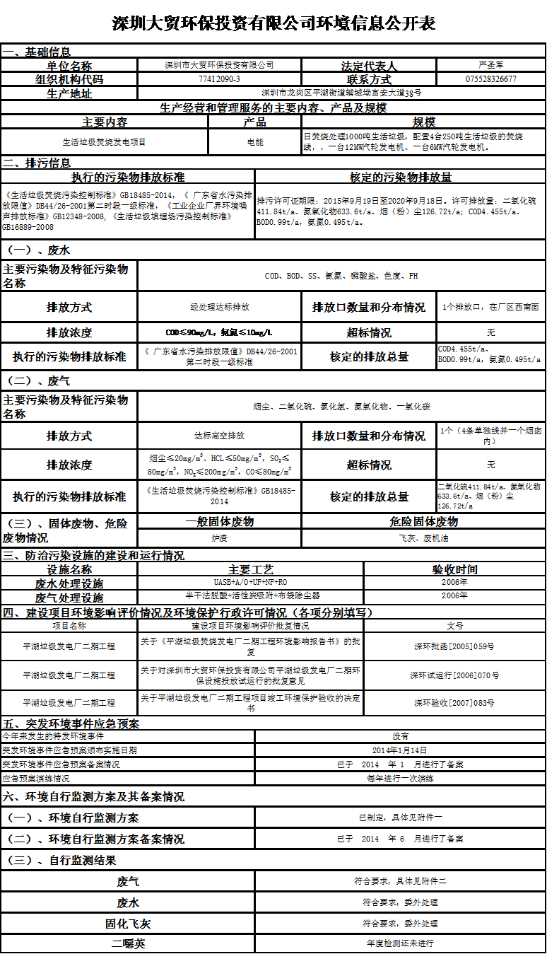 深圳市大貿(mào)環(huán)保投資有限公司2016年環(huán)境信息公開表